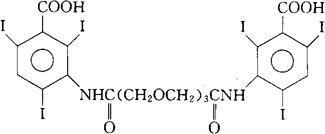 C22H18I6N2O9=1215.82 CAS-51022-74-3 3,3-[氧双[2,1-乙二基氧(1-氧代-2,1-乙二基)亚氨基]]双[2,4,6-三碘苯甲酸]。 3,3-[Oxybis[2,1-ethanediyloxy(1-oxo-2,1-ethanediyl)imino]]bis[2,4,6-triiodobenzoic acid]. 3,3′-[氧双(亚乙基氧亚甲基羰基亚氨基)]双[2,4,6-三碘苯甲酸]。 3,3′-[Oxybis(ethylenoxymethylenecarbonylimino)]bis[2,4,6-triiodobenzoic acid]. 3,3′-(3,6,9-三氧十一烷二酸基二氨基)双(2,4,6-三碘苯甲酸)。 3,3′-(3,6,9-Trioxoundecanedioyldiamino)bis(2,4,6-triiodobenzoic acid). 诊断用药。 Iotroxic Acid,SH 213 AB. INN,BAN,USAN.  |