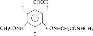 C13H12I3N3O5=670.97 CAS-49755-67-1 3-(乙酰氨基)-2,4,6-三碘-5-[[[2-(甲基氨基)-2-氧代乙基]氨基]羰基]苯甲酸。 3-(Acetylamino)-2,4,6-triiodo-5-[[[2-(methylamino)-2-oxoethyl]amino]carbony]benzoic acid. 5-乙酰氨基-2,4,6-三碘-N-[(甲基氨基甲酰)甲基]间苯二甲酸。 5-Acetamido-2,4,6-triiodo-N-[(methylcarbamoyl)methyl]isophthalamic acid. 诊断用药。 约各利西。 Ioglicic Acid,SHH200AB. INN,USAN.  |