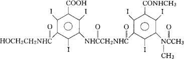 C24H21l6N5O8=1268.89 CAS-59017-64-0 N-(2-羟乙基)-2,4,6-三碘-5-[2-[2,4,6-三碘-3-(N甲基乙酰胺基)-5-(甲基氨甲酰)苯甲酰胺基]乙酰胺基]异间苯二甲氨酸。 N-(2-Hydroxyethyl)-2,4,6-triiodo-5-[2-[2,4,6-trii odo-3-(N-methylacetamido)-5-(methylcarbamoyl)benzamido]acetamido]ispohthalamic acid. 造影药。 碘克沙酸。 Ioxaglic Acid. INN,BAN.DCF,USAN,MI.  |