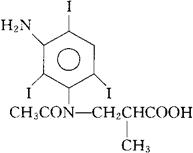 C12H13I3N2O3=613.96 CAS-16034-77-8 3-[乙酰(3-氨基2,4,6-三碘苯基)氨基]-2-甲基-丙酸。 3-[-Acetyl(3-amino-2,4,6-triiodophenyl)amino]-2methyl-propanoic acid. N-乙酰-N-(3-氨基-2,4,6-三碘苯基)-2-甲基-β-丙氨酸。 N-Acetyl-N-(3-amino-2,4,6-triiodophenyl)-2-methyl-β-alanine. 诊断用药。用于胆囊造影药。 约赛塔米酸。 Iocetamic Acid, Cholebrine, MP-620,TD73,Cholimil,Colebrine,DRC 1201. INN,BAN,USAN,USP.