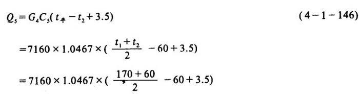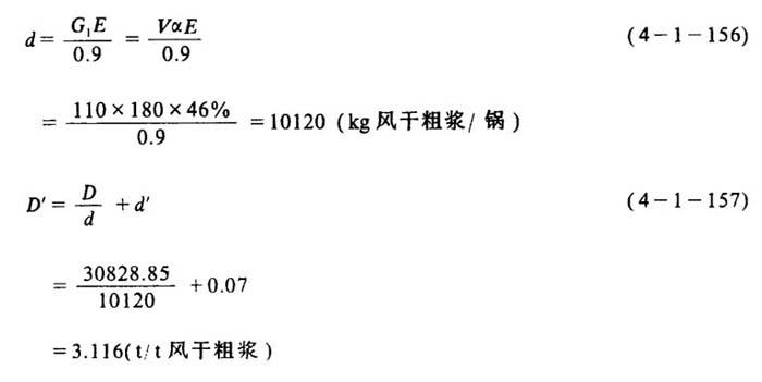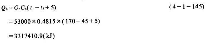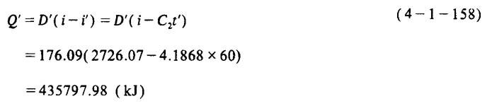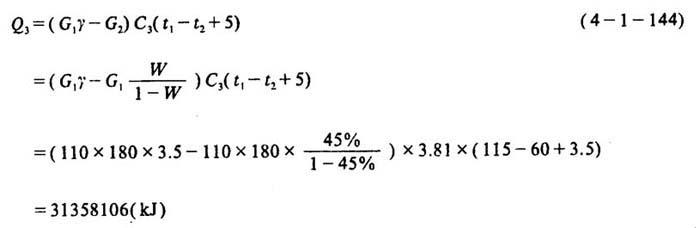 释义 | 碱法蒸煮锅热量衡算及实例 [说明]现以容积为110m3蒸锅,蒸煮半漂硫酸盐木浆为例,对其蒸煮热量衡算的步骤和方法加以说明。与计算有关的数据及已知条件见表4-1-24。 表4-1-24110m3硫酸盐木浆蒸煮锅热量衡算已知数据 1.加热原料中纤维升到最高温度所需热量Q1 2.加热原料中水分到最高温度所需热量Q2 3.加热药液所需热量Q3 4.加热设备及附件所需热量Q4 5.加热保温层所需热量Q5 6.升温时损失的热量Q6 ❷ 送液完毕升温开始时锅内物料所含热量q2 ❸ 锅内物料加热升温1℃所需热量q1 ❹ 开始升温时锅内物料的混合温度t混 ❺ 整个蒸煮过程锅内物料的平均温度T ❻ 求升温时损失的热量Q6 7.保温时损失的热量Q7 8.蒸煮一锅浆所需总热量Q 9.每锅次蒸汽用量D的计算 [已知]饱和蒸汽压力P=1078kPa 蒸汽汽化潜热R=2007.57kJ/kg 加热器效率η=90% 10.蒸煮每吨风干浆耗汽量D′ 11.蒸煮锅小放汽和放锅的热回收计算 [说明]在蒸煮时一般要进行小放汽,而在使用喷放锅喷放时,也要闪蒸出大量蒸汽,如果将这些蒸汽排入大气,不但污染环境,而且造成浪费,因此需进行回收。 ❶ 小放汽热回收计算 [说明]设每锅小放汽两次,两次温度分别为120℃和143℃,两次压力分别由196.2kPa降至0kPa和由392.2kPa降至196.2kPa。 a.小放汽的平均温度t平 b.每吨风干浆放出蒸汽量D′ [说明]设1吨干木片在小放汽时放出90kg蒸汽,若粗浆得率为46%。 c.小放汽放出的热量Q′ [说明]若将小放汽放出的蒸汽用换热器由131.5℃冷却到60℃,131.5℃时蒸汽的比能为2726.07kJ/kg,则: d.加热水量W′ [说明]设冷却水由15℃加热到75℃,则加热水量为: ❷ 放锅时大放汽的热量回收计算 [说明]设生产每吨风干浆在全压喷放时闪蒸的蒸汽量为952kg,喷放用蒸汽70kg。则生产每吨风干浆放出的蒸汽量为: 设蒸煮最高温度为170℃,若将闪出蒸汽在喷射冷凝器内由170℃冷却至90℃,170℃时蒸汽的比能为2773.34kJ/kg,喷射液初温为40℃,则需喷射液量为: 若将喷射冷凝液用换热器由90℃冷却至40℃,而冷却水由150℃升至80C,则需冷却水量为: |