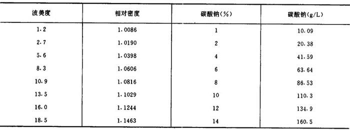 表1-2-11 碳酸钠溶液的浓度与相对密度之间的关系