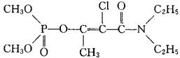 又称大灭虫、Dimecron、Ciba570。 内吸杀蚜螨剂。化学名称:O,O-二甲基-O-〔2氯-2-(二乙基氨甲酰基-1-甲基)〕乙烯基磷酸酯。 化学结构式如下。工业品黄色液体含量92%,含E异构体30%,正异构体70%,后者毒力大于前者,纯品沸点94℃5.33Pa,20℃时蒸气压为3.3mPa、密度( )1.2132,折光率( )1.4721,易溶水、醇、丙酮、二氯甲烷、辛醇及甲苯。 20℃时水解50%,pH5时需60天,pH7时需54天,pH9时需12天。可以防治棉蚜、棉叶螨、蓟马、稻叶蝉、稻飞虱、柑橘全爪螨、锈壁虱。 不用于蔬菜、茶、烟草等作物。大鼠口服LD50为17.4mg/kg,经皮LD50为374mg/kg,对家兔皮肤及眼有刺激作用,属高毒农药。无作用剂量(NEL),大鼠1.25mg/(kg·d)、狗0.1mg/(kg·d)。
