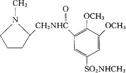 C16H25N3O5S=371.45 CAS-73747-20-3 N-(1-甲基-2-吡咯烷基)甲基-5-(甲基氨磺酰)-邻-藜芦酰胺。 N-(1-Methyl-2-pyrrolidinyl)methyl-5-(methylsulfamoyl)-o-veratramide. 2,3-二甲氧-5-(甲氨基)磺酰-N-(1-甲基-2-吡咯烷基)甲苯甲酰胺。 2,3-Dimethoxy-5-(methylamino)sulfonyl-N-(1-methyl-2-pyrrolidinyl)methyl benzamide. 抗精神失常药。 Sulverapride,Clumirol. INN,DCF,USAN.  |