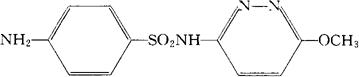 C11H12N4O3S=280.30 CAS-80-35-3 4-氨基-N-(6-甲氧-3-吡嗪基)苯磺酰胺。 4-Amino-N-(6-methoxy-3-pyridazinyl)benzenesulfonamide. 磺胺类药。用于溶血性链球菌、肺炎球菌及脑膜炎球菌等的感染。 长效磺胺,长效磺胺A,磺胺甲氧哒嗪,磺胺甲氧吡哒嗪。 Sulfamethoxypyridazine,Midicel,SMP,Sulphameth oxypyridazine. 磺胺甲氧嗪片(磺胺甲氧哒嗪片)。 INN,BAN,BP,DCF,DCIT,FP,IP,NFN,USAN,USP,MI.  |