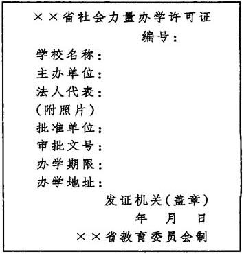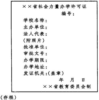 释义 | 社会力量办学许可证 【简介】: 是教委管理社会力量办学使用的文书,它有以下特点:1.内容明确。社会力量办学许可证,要准确标明学校名称、办学地址、批准单位、发证机关,不能遗漏,也不能误填。2.有法规效用。社会力量办学许可证具有行政和法律的约束力,用它可向工商、税务、物价等部门申办有关手续;如有违犯,必追究法人代表的责任。3.有时限要求。延长办学时间,应按照审批程序补办手续。社会力量办学许可证,有固定格式,需要时,填写盖章发给;要用钢笔或毛笔填写,不能用铅笔或圆珠笔填写;字迹要端正、整洁,不能涂改。 【范例】: |