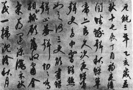 【赏析】: 康里巎巎爲生活在元代中后期的少数民族书家,曾受其父亲不忽木和哥哥康里回回影响,以书法名擅当时。善眞行草书,得晋人笔意。草书逸迈跌宕,光彩飞动。其草书师法锺王,旁及米南宫,亦曾临习怀素自叙草书帖。笔画刚健,转折圆劲,神韵可爱,其中逸迈处颇得王献之风神。元代书法,赵孟頫妍丽纤巧、姿媚秀润的书法风靡一时,其时书家饶介、张雨等皆趋步赵孟頫,而康里巎巎却能不爲时风所限,高视阔步,卓立独行,形成奇崛独出、刚健雄放的面貌。康里巎巎常在草书中杂以章草用笔,此幅草书中却绝然不见章草形迹,也丝毫不见前人所评的“遒媚”气象。字裏行间透露出傲岸不羁的神采,时以尖锋出毫,字与字之间不相连属,仅偶有二字相连。虽不作连绵状,但仍流露出一以贯之,笔断意连的气脉。用笔刚毅神速,笔画雄健奇伟。解缙评其草书爲“雄剑倚天,长虹出海”,可谓的评。康里的书法对后世有著很大影响,从明初宋克的草书中便可窥见这种影响的余緖。 |