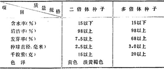 释义 | 种子、播种量、播种适期 生产用种子的纯净率(清洁度)不应低于97%,清洁好的种子一般都高于这个标准。纯种球的湿度不高于15%。种子发芽率不能低于75%。健康的甜菜种子使用年限为如表1-13。我国在生产上所使用种子的标准规格如表1-14。 表1-13 健康甜菜种子寿命和利用年限 甜菜种子贮藏的安全含水量不应大于种子重量的12% 表1-14 甜菜种子标准规格 保证全苗是获得高产稳产的重要因素之一。在良好的条件下,甜菜的播种量以1.25公斤/亩为宜。 依照种子的千粒重换算每公斤种子颗粒数如表1-15。播种量可依照下列公式计算: 表1-15 甜菜种子千粒重和每公斤粒数换算表 播种量(公斤/亩) 甜菜的播种期须根据当地的气候情况、土壤湿度和温度以及病虫害发生规律和制糖期的生产要求等具体情况,因地制宜地确定。在一般的情况下,以物候做播期的依据时,当杏子含苞待放时,是甜菜播种的最适宜期。在终霜期较晚或春风多、风大的干旱地区,幼苗出土后容易遭受冻害和风害。在这些地区应掌握播种适期,使幼苗出土后能够躲过风冻的危害是很重要的。 |
