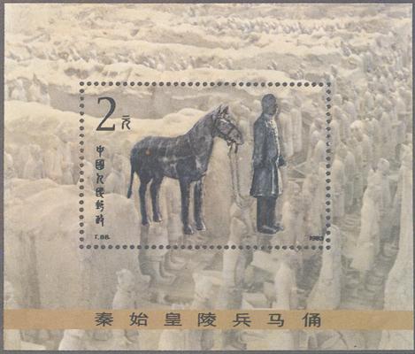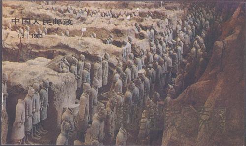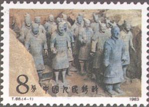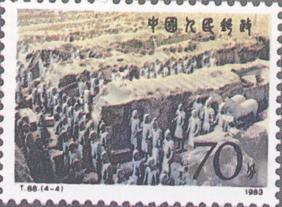 发行日期:1983年6月30日 齿孔度数: 印刷版别:影写版 票幅:40×30 全张枚数:50(5×10) 设计者:吴建坤 印刷:北京邮票厂     (1)8分 群俑 1038.22万枚 (2)8分 陶俑 1002.09万枚 (3)10分 兵马俑 498.84万枚 (4)70分 兵马俑坑 274.72万枚 (1)-(4) 4枚全 SB(9)1983 秦始皇陵兵马俑(小本票) 发行日期:1983年6月30日 小本票规格:140×85 邮票面值及枚数: 8分×4+10分×3+70分+2.00元=3.32元 设计者:吴建坤 印量:45.82万本  T 88M 秦始皇陵兵马俑(小型张) Terra-cotta Warriors and Horses in First Emperor’s Tomb of Qin Dynasty(Miniature Sheet) 发行日期:1983年6月30日 齿孔度数: 印刷版别:影写版 票幅:60×40 设计者:吴建坤 小型张面积:100×85 印刷:北京邮票厂  (1)2元 牵马俑 85.04万张 1张全 |