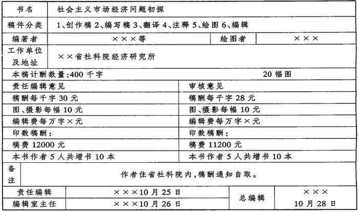 【简介】: 稿费支付通知单是编辑室通知稿酬管理部门支付稿酬的凭据。 稿酬标准是根据国家颁布的稿酬办法,按照书稿的质量确定的,实行责任编辑、编辑室主任和总编室三级审查制。稿费支付通知单内容包括:书名、著译者名、著译者工作单位及地址、出版年月、版次、印数、定价、全书字数、每千字付酬标准以及图片稿费、预支稿酬,编辑费、审稿费、校对费、编辑加工费都可以用同一通知单填写并作为支付凭证。稿酬支付通知单经核定后,由稿酬管理部门具体计算,然后寄给著译者,本地著作者可自取。 【范例】: ××××出版社稿费支付通知单 1993年10月24日
