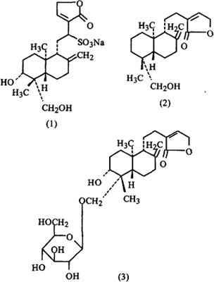 释义 | 穿心莲 【名称出处】:广州部队《中草药手册》 【概况】: 异名 春莲秋柳(《岭南采药录》),一见喜(《泉州本草》),榄核莲、苦胆草、斩蛇剑、圆锥须药草(广州部队《常用中草药手册》),日行千里、四方莲、金香草、金耳钩、春莲夏柳、印度草(《广东中草药》),苦草(《福建中草药》), 基源 为爵床科穿心莲属植物穿心莲的全草。 穿心莲属全世界约20种;中国约5种,均为药用植物。 原植物 穿心莲Andrographis paniculata(Burm f.)Nees 历史 本种亦名春莲秋柳,首载于《岭南采药录》,云“能解蛇毒,又能理内伤咳嗽。”后《泉州本草》称为“一见喜”云有“消炎解毒、消炎退肿”的功能。 形态 一年生草本。 茎高50~80cm,四棱形,下部多分枝,节膨大。叶卵状矩圆形至矩圆状披针形,长4~8cm,顶端略钝。 总状花序顶生和腋生,集成大型圆锥花序;苞片和小苞片微小,长约1mm;花萼裂片三角状披针形,长约3mm,有腺毛和微毛;花冠白色而下唇带紫色斑纹,长约12mm,外有腺毛和短柔毛,2唇形,上层微2裂,下唇3深裂,花冠筒与唇瓣等长;雄蕊2,花药2室,1室基部和花丝一侧有柔毛。蒴果扁,中有1沟,长约10mm,疏生腺毛;种子12颗,四方形,有皱纹。 花果期夏、秋季。(图见《中国高等植物图鉴》.第4册 166页.图5746) 生境与分布 生长于温暖湿润环境,以排水较好、肥沃的沙质壤土为宜。山东、江苏、浙江、江西、福建、广东、广西、云南有栽培。。 【生药】: 栽培 适于温暖湿润环境。 不耐严寒。以排水良好而肥沃的砂质壤土为宜。用种子繁殖,直播或育苗移栽。种子萌发适温25~30℃,大田直播,常因前期气温低,出苗迟,产量低,多以育苗移栽为主。 一般南方3~4月、北方于4月温床育苗。播前需催芽,将种子浸在35~45℃的温水中24小时,取出稍凉后播种,按行距30cm开划浅沟条播或撒播。 播后覆细土或草木灰,以不见种子为度,并浇水保湿。每亩用种量0.5kg。 为了提高地温,播后铺上塑料薄膜,再盖上稻草,最后架上塑料环棚。 苗床内温度以不超过30℃为好。 出苗时揭除盖物,注意通风,保持土表湿润。苗高4cm时出圃移栽,按株行距20×27cm穴栽。 定植后结合中耕除草,用人畜粪水或氮素化肥追施3~4次。留种田还应在孕蕾期喷施2%过磷酸钙液1~2次。病害有猝倒病,发病时用50%托布津可湿性粉剂1000倍液喷雾;疫病,喷1.1∶120的波尔多液或70%敌克松可湿性粉剂500倍液防治。 注意棉铃虫、地老虎、非洲蝼蛄等虫害防治。 采集 夏、秋季采割地上部分,晒干。药材主产于广东、福建,江西、湖南、广西、四川及上海也有产。 鉴别 性状 全草长50~70cm。茎四棱,多分枝,节略膨大,质脆,易折断。单叶对生,叶柄短或近无柄,完整叶片披针形或卵状披针形,长3~12cm,宽2~5cm,先端渐尖,基部楔形而下延,全缘或波状,叶面绿色,叶背灰绿色,两面光滑。气微,味极苦。 显微 叶片横切面:上表皮细胞扁平;钟乳体众多,另有两晶细胞相连的双钟乳体,以沿叶脉处较多见;非腺毛圆锥形,1~4细胞,具角层纹理或微具壁疣;偶有腺鳞。栅状组织为1列长圆柱形细胞,与中脉中部毗连。 海绵组织为4~5列薄壁细胞。下表皮有腺鳞,头部4、6、8细胞,柄单细胞,极短;另有细尖的单细胞毛;亦有少量钟乳体。(图见《中药志》.第4册.第2版.559页.图546) 茎横切面:四角茎棱外突。表皮细胞外壁稍增厚,角质化,内含钟乳体;具单细胞头的腺毛,柄3细胞。 厚角组织分布在表皮下四角处。绿皮层2~3列细胞纵向延长,充满叶绿体;内皮层细胞稍大。 韧皮部皱缩。形成层不明显,木质部宽阔,初生木质部细胞壁非木化;射线宽1~3列细胞,含淀粉粒。髓的中心部分有少量针状结晶散在或成团。 (图见同上.560页.图547) 叶粉末:绿色。 ❶ 上下表皮均有增大的晶细胞,内含大形螺状钟乳体,上表皮晶细胞较大,呈棒形、椭图形、长圆形或类圆形,长48~210μm,直径30~48gm,膨大端约至67μm;下表皮晶细胞较小;钟乳体形状与晶细胞一致,长约至180μm,直径约至36μm,较大端有脐样点痕,层纹波状,边缘不平整,尚有两个晶细胞相接。 ❸ 腺鳞头部扁球形,4、6、8细胞,直径27~33μm,柄极短。短腺毛偶见,头部2细胞,侧面观宽约30gm;柄单细胞而短。 (图见《中药材粉末显微鉴定》.325页.图156) 理化 取样品粉末0.5g,加乙醇15ml,回流提取30分钟,提取液点于硅胶G板上,以新穿心莲内酯、穿心莲内脂、14-去氧穿心莲内脂、14-去氧-11,12-二去氢穿心莲内酯的乙醇溶液为对照,以氯仿-无水乙醇(19∶1)为展开剂,展距12.5cm喷2%3,5-二硝基苯甲酸甲醇溶液-0.5mol/L甲醇制氢氧化钾甲醇溶液(1∶1),在105℃加热约5分钟,显紫红色斑点。(图见《中药志》.第4册.第2版.561页.图548) 加工炮制 取原药材,除去杂质,抢水洗净,切短段,干燥。 贮藏 置干燥处。 。【化学】: 主要成分是二萜内酯和黄酮。 二萜内酯化合物有:穿心莲内酯(又名穿心莲乙素,Andrographolide)、去氧穿心莲内酯(又名穿心莲甲素,Deoxyandrographolide)、新穿心莲内酯(又名穿心莲丙素,Neoandrographolide)、高穿心莲内酯(Homoandrographolide)、14-去氧-11-氧化穿心莲内酯(14-Deoxy-11-oxoandrographolide)、14-去氧-11,12-二去氢穿心莲内酯(又名穿心莲丁素,14-Deoxy-11,12-didehydroandrographolide)[2]、穿心莲甙(穿心莲内酯甙,Andrographoside)、14-去氧穿心莲甙(14-Deoxyandrographoside)[3]、脱氧穿心莲内酯-19-β-D-葡萄糖甙(Deoxyandrographolide-19-β-D-glucoside)[4,5]、14-去氧-12-甲氧基穿心莲内酯(14-Deoxy-12-methoxy andrographolide)、和新结构穿心莲宁(Androgr