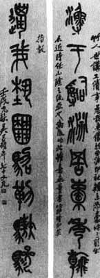 释义 | 竹人世讲联 【简介】: 近代·吴昌硕书于壬戌(1922)九月,时年七十九岁。纸本。大篆。八言对联一则。联文十六字,款署六十二字。 【赏析】: 吴昌硕的这幅大篆楹联,著力于《石鼓文》,并掺以草法,自出新意。不仅字写得凝练遒劲,拙朴纵恣,而且气槪恢宏,一派大家风度。 吴昌硕的大篆个性十足。以这幅篆书楹联爲例,凡字爲左右结构者,在结体上,他大多有意将左右两部分左低右高地上下取势,这就打破了过于均衡呆板的结构格式,使不少单字本身就已具备形势,险中见奇。将这种左右两部分上下取势的字,同字的左右呈中心对称的字组合在一起,动态与静态参错,险奇与均衡相映,对比度非常强烈,造成一种特殊的艺术效果。其运笔凝重,气息深厚,笔力苍劲古厚,尤爲人们称道。吴昌硕篆书作品的另一特点,就是注意整体效果。初看,他这幅楹联似字距偏小,行书款识亦如此,然而,整幅楹联却又给人以茂密结实、一气呵成之感,整体效果非常明显。 再看行书款识,他是以作篆之笔横涂直抹,使人感到恣肆雄浑,不同凡响。吴昌硕非常注意落款的布局,这可以说是他的书作的又一个特点。题款内容,随心所欲,形式不拘一格。以这幅楹联爲例,款分四行,作两组书写,第一组爲三行,这第三行只有两字,两联虚实相映,互相衬托。这种落款上的布白给人的感觉,并非不均衡,而是富变化。 从这幅楹联中我们可以受到许多啓迪,得到许多敎益。细细揣摩优秀墨迹,注意力绝不应只是停留在用笔用墨上—那只是要揣摩的一部分甚至是一小部分内容;更多的内涵,需要我们细心地、全面地去发掘、领略,久而久之,眼界就会渐渐放开,视野就会慢慢开阔,艺术修养也就会逐步得到提高了。 |