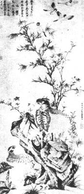 【作品赏析】: 王渊此图又名《花竹禽雀图》。 画竹石上下栖二只很大的角鹰(或称吐绶鸟)。湖石后面与竹枝并生在一起的,是以墨笔绘的杜鹃花。 以墨画出杜鹃的深浅浓淡和柔嫩感,正显出画家功力的深厚。竹尖上落一小雀,另有三只正在飞去,小雀皆黑头黑尾,白灰色背与肚。它们的喧闹似乎没有引起角鹰的任何反应,彼此各不相扰,俨然是一个和平的世界。画面特点一是极为工细,——禽鸟花竹纯以细笔,石则以粗笔皴染,加之鸟与花枝动态活泼,工而不板。 自宋以来,就有人纯以水墨画工细的花鸟画。本来自唐代发展起来的花鸟画是以绚丽的重彩取胜的,至南宋院画尤甚。 随著文人画的兴起,一种崇尚淡雅淡泊的审美思潮时兴起来,因此除水墨山水之外,又出现了工细的水墨花鸟,赋予自然中的生命以清素高雅的格调。这反映的主要不是物态的真实,而是心态的真实,花鸟成了人们社会心理的一种象征、一种寓意。王渊幼即接受了赵孟頫的指教,花鸟师黄筌,但他的墨花鸟竹石,则是时代的产物。 此图自识“至正甲申(1344)夏六月望,钱塘王若水为思齐良友作于西湖寓舍”,钤二白文印。 。  元 王渊 轴 纸本墨笔 纵137.7厘米 横59.5厘米 |
