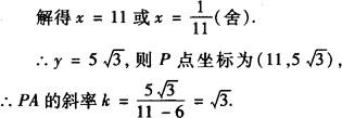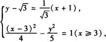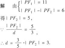 释义 | 等轴双曲线 实轴和虚轴相等的双曲线叫做等轴双曲线. 例1 设双曲线与椭圆 策略 先求出椭圆的焦点坐标,即双曲线的焦点坐标,再定双曲线标准方程的形式,利用条件求待定系数a,b. 解 由已知得双曲线两焦点分别为F1(0,—3),F2(0,3). 设双曲线的方程为 ∵双曲线与椭圆有一交点纵坐标为4, ∴它们交点为 ∵||AF1|—|AF2||=2a, ∴将A、F1、F2的坐标代入得a=2, 又∵c=3, ∴b2=c2—a2=5. 故所求双曲线的方程为 例2 已知双曲线关于两坐标轴对称,且与圆x2+y2=10相交于点P(3,—1),若此圆过点P的切线与双曲线的一条渐近线平行,求此双曲线的方程. 解 切点为P(3,—1)的圆x2+y2=10的切线的方程是3x—y=10. ∵双曲线的一条渐近线与此直线平行,且双曲线关于两坐标轴对称, ∴两渐近线的方程为3x±y=0. 设所求双曲线的方程为9x2—y2=λ. ∵点P(3,—1)在所求的双曲线上, ∴λ=9×32—(—1)2=80. ∴所求双曲线的方程为9x2—y2=80,即 例3 已知A、B、C是我方三个炮兵阵地,A在B的正东,相距6km,C在B的北偏西30°,相距4km,P为敌炮阵地,某时刻A处发现敌炮阵地的某种信号,由于B、C两地比A距P地远,因此4s后,B、C才同时发现这一信号(该信号的传播速度为1km/s),A若炮击P地,求炮击的方位角. 解 如图所示,以BA所在直线为x轴,过点B垂直于直线BA的直线为y轴建立直角坐标系,单位长度为千米,则点B、A、C的坐标分别为(0,0),(6,0),(—2, ∵|PB|=|PC|, ∴点P必在线段BC的垂直平分线上. ∵ ∴直线PD的方程为 又∵|PB|—|PA|=4, ∴点P必在以点A、B为焦点的双曲线的右支上,设P点坐标为(x,y),双曲线方程为: 联立式❶ 、❷ 解方程组 ∴炮击的方位角为东偏北60°. 例4 双曲线 策略 将双曲线的第一定义与第二定义综合运用 故点P到右准线的距离为3. |