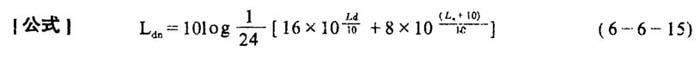 释义 | 简便计算 [说明]在实际应用中,上式较麻烦,可用下式简便计算。 式中 L1——某间隔时间t随机读出的声级(dB) n——时间T内读取的L1声级的总个数 1.对环境噪声的等效声级计算 [说明]每5s钟读一个读数,根据ISD建议n取100个数 2.交通噪声的等效声级计算 [说明]取n=200 ❶ 交通噪声级可直接用L10、L50、L90来描述,目前倾向于用噪声污染级LNP来描述。 [公式] LNp=Leq+2.59σ (6-6-11) 式中 σ——标准差 ❷ 在车流量多于100辆/h,测量时间大于15min钟时,其噪声级的分布基本符合正态分布。 ❸ 对机动车辆噪声的评价标准计算方法通常用噪声污染指数TNI表示。 3.昼夜等效声级的计算 [说明]同样的噪声,晚上比白天更感到吵闹,也就是说,同样的噪声在晚上干扰更大。为了在评价时把这些因素考虑进去,美国环保局提出了昼夜等效声级Ldn的概念,即在考虑一天24h的等效声级时,晚上的噪声要加10分贝(A)。 式中 Ld——白天(6∶00~22∶00)的等效声级 Ln——夜间(22∶00~6∶00)的等效声级 Ldn——昼夜等效声级 |