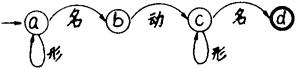 释义 | 简单转移网络 自然语言自动识别或生成的模式之一。由一组用弧连接起来的状态所组成。每一条弧标记一个词或一个词类,并且代表两个状态之间的一个转移。如图所示: 状态由圈来表示,弧用两个状态之间的弧线来表示。弧线所带的箭头指示弧的方向。在句子的识别或生成中,过程沿著网络循序前进--沿著弧的每一次转移,都牵涉到词的序列中的一个词。该模式就在状态的一步一步的转移中被运用。整个过程必须始于初始状态(用一个小箭头作标记),止于终了状态(用加双圈来表示)。上面这个转移网络,可以拿来与诸如”肥胖卷毛的熊喜欢蜂蜜”之类的句子相匹配。从状态a开始,通过一系列弧:”a-形→a-形→a-名→b-动→c-名→d”,达到终了状态d,从而完成一个句子的识别或生成。 |