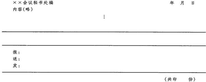 【简介】: 简报是用来反映情况、沟通信息的一种短小精悍的公务文书,兼有汇报、交流和指导的作用。简报又称“动态”、“简讯”、“要情”、“摘报”、“工作通讯”、“情况反映”、“情况交流”、“内部参考”等。简报具有简、精、快、新、实等特点。 常见的简报有三种:一是会议简报,摘报、交流会议情况,引导会议进展;二是情况简报,反映人们关注的问题,供领导机关参考;三是工作简报,扼要地报告重大问题的处理情况以及工作动态、经验和问题等。 简报一般由三部分构成:(1)报头。在简报的第一页上方,约占全页1/3的位置,包括简报的名称、期号、编号、密级、编发机关名称、编发日期等。(2)报核。刊登一份材料或者相同类型的几份材料。(3)报尾。位于简报最后一页下方,包括发送范围和印制份数。 【范例】: 编号: 机密 ×××会议简报 (第 期)