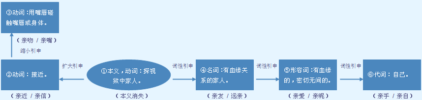 释义 | ![]() (親) 关系近;感情好: ~近|~热。 疏 shū 亲~有别|不分亲~。 ❶有血统或婚姻关系的。常作定语。 令尊令堂的这种至切~情对家人影响极深|大家都说您是我的~爸爸,我是您的~女儿。 ❷感情好,关系密切。常作谓语。 老师真好,比我的亲人还要~。 ❸亲自。多用于书面语。常在单音节动词“赴”“临”前作状语。 王部长从百忙中抽出时间~临现场审查节目|各级领导要~赴生产第一线,及时解决生产中存在的实际问题。 用嘴唇接触,表示亲热。能重叠。常作带宾、带补谓语。 ~脸蛋|妈妈~~我吧|奶奶抱着孙子~了两下|~了起来|她~得妈妈心里乐滋滋的|孩子,过来~一下妈妈|他走过去~了一下熟睡的孩子。 【近】 〈动〉吻 【反】 〈形〉❷疏 【词语】 亲笔 亲耳 亲近 亲口 亲历 亲临 亲昵 亲戚 亲人 亲善 亲身 亲生 亲手 亲属 亲如手足 亲如兄弟 亲痛仇快 亲信 字源解说 辛,既是声旁也是形旁,表示刑罚。親,金文 ![]() ![]() ![]() ![]() ![]() ![]() ![]() ![]() ![]() 附 文言版《説文解字》:親,至也。从見,亲聲。 附 白话版《说文解字》:親,关系至近至密者。字形采用“见”作边旁,“亲”作声旁。 引申线索 ![]() 【字族索引】 亲 【同音字】 qīn qìng |