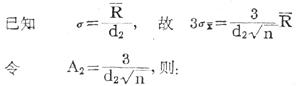 A1与A2数值可根据样本容量(n)查表取得。  根据正态分布理论,生产情况正常时,所抽样本平均数( )超出控制上、下限的概率只有0.003。假设超出这个界限,可认为生产过程发生了异常变化。 |