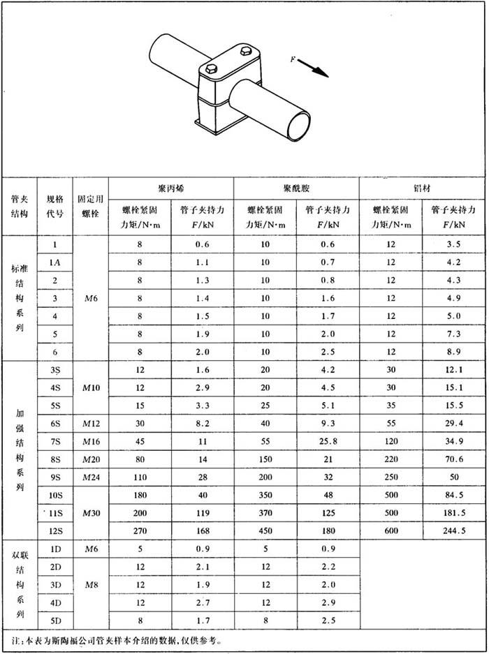 释义 | 管夹 (1)用途 管夹、管架、管箍等,都是用来支撑和固定管路的。见图30.3-1。它们不仅加固了管路强度,而且还起到吸收振动和降低噪声的作用。同时还能使系统管路的布置整洁美观,检查维修也方便。 (a)用于粗管的管架和管箍;(b)单孔管夹 1-管架;2-管箍;3-管夹 (2)管夹的型式与尺寸 管夹型式有多种,除标准系列单孔管夹、双孔管夹之外,还有多孔管夹、圆钢管夹(箍)、扁钢管夹(箍)、拉紧式薄型管夹、加厚管夹和焊接结构的管夹等。材料除用金属材料钢和铝以外,还有聚丙烯和聚酰胺等材料。 A.塑料管夹JB/ZQ4008-84(摘录) (A)中型系列(A系列):表30.3-1 表30.3-1 塑料管夹(A型)尺寸 单位:mm M.黎明公司管夹 国内另有生产与美国派克公司相同的管夹系列产品(温州黎明液压机电公司)。该产品适用于钢管和软管,其产品型式与尺寸与德国DIN3015标准类同。国内进口设备中用此类管夹较多。其产品系列: 轻型管夹:管外径由Φ6~Φ57mm。见图30.3-3(a)。 双联管夹:管外径由Φ6~Φ42mm。见图30.3-3(b)。 重型管夹:管外径由Φ6~Φ220mm。见图30.3-3(c)。 (a)轻型管夹;(b)双联管夹;(c)重型管夹 管夹材质:聚丙烯-使用温度-30~+90℃。 聚酰胺-使用温度-40~+120℃。 根据用户要求也可生产铝制管夹。 N.模压钢板管夹 此外,国内还生产一种模压钢板管夹。适用钢管外径Φ6~Φ102mm,见图30.3-4。 O.球墨铸铁管夹 另一种球铁管夹,用于管外径Φ73~Φ426mm,见图30.3-5。 P.国外管夹 有关国外管夹,德国斯陶福公司(Stauff)最具代表性,该公司管夹在国际市场占有率达70%以上,在其本国市场约占95%。 该公司生产的标准结构系列管夹(按DIN3015第1部份)、加强结构系列(按DIN3015第2部份)和双联结构系列(按DIN3015第3部份)与国内温州黎明液压机电公司生产的轻型管夹、重型管夹和双联管夹基本相同。除此之外,还生产有圆钢管箍(见图30.3-6a),扁钢管箍[图30.3-6(b)],扁钢管夹(按DIN3567)[图30.3-6(c)],拉紧式管夹(图30.3-6d),还有用地脚螺栓固定的管夹[图30.3-19(e)],以及其他特殊管夹等。 (a)圆钢管箍;(b)扁钢管箍;(c)扁钢管夹;(d)拉紧式管夹;(e)用地脚螺栓固定的管夹 (3)管夹的使用要求 ·两个相邻管夹的间距,按相应的管外径配合。其间距表见表30.1-7。 ·弯管的两边直管段均应有固定的支承点,见图30.1-3。 ·管夹上螺栓的紧固力矩和管上的轴向夹持力(根据DIN3015第10部份),见表30.3-14。 表30.3-14 管夹螺栓的紧固力距和管子的夹持力 |