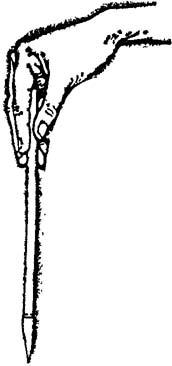 唐韩方明《授笔要说》云:把笔法有五种。“第二管,亦名拙管。谓五指共其管末,吊笔急疾,无体之书,或起藁草用之。今世俗多用五指管书,则全无筋骨,慎不可效也。”元陈绎曾《翰林要诀·执笔法》云:“管,以大指小指倒垂执管,三指攒之,就地书大幅屏幛。”此种执笔法捉笔过高,下笔易飘,不易著力,故亦有人称之为无体之书。
