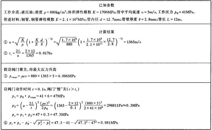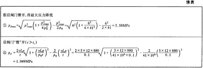 释义 | 管道中的压力瞬变 当管道中的阀门骤然关闭或开启时,管中液体的压力发生急剧交替升降的阻尼波动过程称为液压冲击(或水锤)现象。液压冲击是管道中的非定常流问题,是一种瞬变的动态过程。 当阀门骤然关闭时,管中原来动能将转变为压势能,在阀门前将出现压力升高,其值有可能危及液压系统的元件,并伴有振动与噪声。反之当阀门骤然开启时,则会出现压力降低,当其绝对压力降低于液体的饱和蒸汽压力时,则会发生气穴现象。这都将会影响液压系统的正常工作。这两种骤然开或关所发生的液压冲击,都称为直接液压冲击,其压力升降见图1.2-5。 当阀门开关时不是瞬时骤然动作,其开关时间t大于tc=2L/c的情况所发生的液压冲击,称为间接液压冲击,其危害性较直接液压冲击要小。 (1)直接液压冲击的最大压力计算 当阀门骤然关或开时,即阀门动作时间t<tc=2L/c,则管道内产生的最大压力升高为prmax或最大压力降低为pdmax。 A.等径直管端阀门骤然关闭 当管道中液体以平均流速v流动著,管端阀门骤然关闭,运动著的液体冲击关闭了的阀门,将动能转变为压势能,而使被压缩的液体段的压力增为最大压力升高prmax。 B.串联管端阀门骤关 在图1.2-7所示的串联管道中,当末端阀门骤然关闭时所发生的最大压力升高为 式中 l1,l2,l3——各串联管道的长度; v1,v2,v3——各串联管道的相应的平均流速; La——各串联管道的总长 La=l1+l2+l3+… C.等径直管端阀门骤开 在等径直管末端阀门骤开时,出现的最大压力降低为 式中 p0——管中原来的工作压力; prmax——按式(1.2-7)计算。 D.串联管端阀门骤开 其最大压力降低仍用式(1.2-9),其中最大压力升高prmax应按式(1.2-8)的串联管的情况来计算,p0则应按串联管内的原来工作压力计算。 (2)间接液压冲击时压力计算 实际上阀门的开或关,总是有一定的时间t,当t>tc时,其产生的压力降低或升高都不会达到骤时开关的最大值。这种有一定动作时间的开或关就简称为“慢”开或“慢”关。 A.等径直管端阀门“慢”关(t>tc)此时管中的压力升高为 式中 L——直管长度; t——阀门关闭时间。 B.串联管端阀门“慢”关(t>tc) 式中 C.等径直管端阀门“慢”开(t>tc)管中压力降低为 式中 L——直管长度; t——阀门开启时间。 D.串联管端阀门“慢”开(t>tc) 串联管中压力降低为 式中 t——阀门关闭时间。 (3)等径直管内的液压冲击计算实例见表1.2-6。 表1.2-6 液压冲击计算实例 (4)液压冲击的防止措施 当液压系统发生液压冲击时,会产生噪声、振动,甚至损坏系统元件及管道,为了保持系统的正常工作,应尽量削减其影响。常用的措施为: ·尽可能地使阀门动作平缓,如换向阀中采用带锥台肩的阀芯,或采用可调先导式液控换向阀控制主阀芯的切换速度,以缓和液压冲击。 ·在紧靠液压冲击源附近设置卸荷阀。 ·在易产生液压冲击源(如阀门)前设置吸冲击压力的蓄能器。 ·按各类管件选用合理的流速。 |