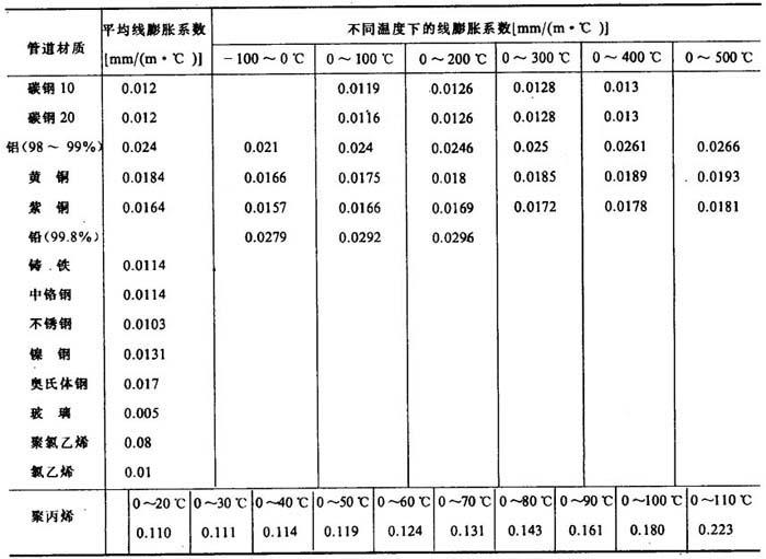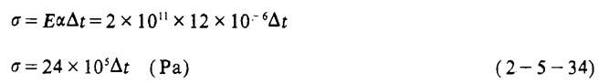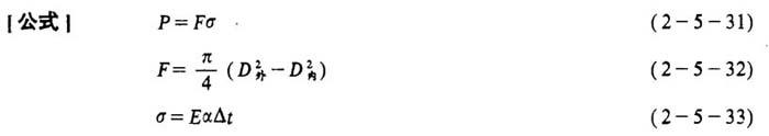 [说明]管道受热膨胀时,能产生极大的轴向推力,因此,必须据此对管道进行热膨胀补偿,否则,将对管架和构筑物造成破坏,危及管道系统的安全运行。  式中 P——管道产生的轴向推力(N) F——管道的截面积(m2) σ——管材的热胀应力(Pa) D外——管道外径(m) D内——管道内径(m) E——管材的弹性模数,E随材质品种和工作温度的不同而变化。钢材的弹性模数取为2×1011Pa;硬聚氯乙烯为0.032×1011Pa α——管材的线膨胀系数[m/(m·℃)],见表2-5-28 表2-5-28 不同管材的线膨胀系数α  △t——同上 [讨论]对于钢材管,E=2×1011Pa,α=0.012mm/(m·℃)=12m/(m·℃),则其热膨胀应力为:  [例]有一Φ325×8mm的无缝钢管,投入运行后的温度为150℃,而安装时的温度为25℃,如果将管道两端固定,因膨胀而产生的轴向推力是多少? 解:热胀应力为:  管材的截面积:  故管道产生的轴向推力:  |