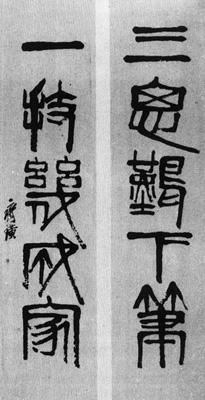 【简介】: 现代·齐白石书。纸本。篆书。五言联一副。凡上下联正文十字,款二字,共十二字。刊于《民国时期书法》(下)。 【赏析】: 朴质雄健是齐白石这副对联的鲜明艺术个性。其书体在篆隷之间。那奇伟宽宏,体方笔圆的字势,那雄快震动有渴骥怒猊之势,强调劲折与字脚而又粗细变化的用笔,都充分显示出作者汲取、熔铸秦汉,尤其是汉篆的本领。作品最终以作者那健康、有力、豪迈的情慨出之,此中反映了作者无娇饰、有眞意的人格本色与审美理想。这正是齐白石的艺术作品所以能感动读者的根本原因。也正因爲如此,我们就不可以“委婉蕴藉”来要求于它。 但是,就形式美而言,这幅作品也有它的不足之处:“思”字下部“心”的“卧鈎”过于向右下斜伸,笔势与整幅作品取势的基调不甚谐调;“几”与“成”字两个“戈”相邻而有平行、雷同之弊,缺乏适当变化。这些,也都是显而易见的。