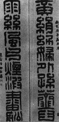 【简介】: 淸·六舟达受书于道光庚子(1840)。纸本。篆书。集八言联。凡上下联正文十六字,款十三字,共二十九字。刊于日本《书道全集》(二十四)。 【赏析】: 汉代是我国书法史上第一个伟大的变革时代。对秦篆,在结体等方面都进行了创造性的改革。秦篆结体修长,大小一律,转折多用圆笔,而汉篆变长爲方,化圆爲直,随著字画的省简而字形大小不一,有扁有方,特别宜于摹印及装饰用。  首先,汉篆对秦汉在结构上进行省减,成爲汉代的“简化字”,如作品中的“雨”字、“风”字、“烟”字、“书”字都省减了笔画,这完全是因爲装饰、应用的需要,因而汉代书家藐视六书的规範。其次,化圆爲方,线条尽量走直线,并将某些笔画延长作回曲折叠之状,回曲处以方折爲主,这也完全是布局的需要,如“片”字、“外”字。笔画多者字形大,笔画少者字形小,以疏密匀称、朴茂爲度,这也是爲了装饰美化的需要。从此幅作品来看,“幼”字、“外”字、“臼”字、“船”字等比较小,而“黄”字、“绢”字、“韭”字、“书”字等比较大,虽然每个字大小不一,但总体上看,上下联对得又非常工稳,显示了达受僧布局取势的深厚功夫。尽管汉篆对秦篆作了许多成功的改革,似乎是随心所欲的简化和方折,实际上汉篆对秦篆却有严格的师承。 |