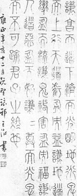 释义 | 篆书立轴 【简介】: 淸·王澍书于雍正辛亥(1731)十二月。篆书五行。刊于日本《明淸书道图说》(九十七)。 【赏析】: 王澍幼年家贫,靠手钞书本而刻苦自学成才的。从他的楷书来看,师法唐代欧阳率更,楷法精湛,结构稳称,纯熟自然,虽写得酷似欧阳氏,可惜的是没有什么新的突破,也更说不上有创造性了;而其行书是宗明代文徵明的风格,写得古意古法,淸劲秀逸,虽有诱人的风姿,却显得有点流于纤弱,终掩盖于文氏之下了。但是王澍在篆书方面,是有卓越的突破和贡献的,他那凝重醇古的艺术个性,正如淸代书法家翁方纲所说:“篆书得古法,行书次之,正书又次之。”这种评价是完全符合实事求是的。 在王澍晚年时期也正是金石碑学酝酿期和发机期,受碑学之风影响,他在这方面的功夫也是相当的精湛,具有淸代情致的尙质书风,故能在淸代名重一时。观其篆书立轴,结字匀称端庄,法度分明,规整森严,笔画纤细,笔力内凝,入规出矩,颇有法度,一看便知是宗秦代李斯和唐代李阳冰一路风格,用笔善于藏锋圆茎,淸劲挺秀,盘屈缭绕,柔和婉转,由于他不囿于师门,所以字形显得端正大度,圆润有姿,淸秀匀静,耐人品味,可谓晚年“玉箸”篆书体中的精品之一。这位“老而愈精,名播海内”的书家作品,与其“爲人天眞烂漫,不急名位,人与之交如坐春风”的高尙情操是统一的。 |