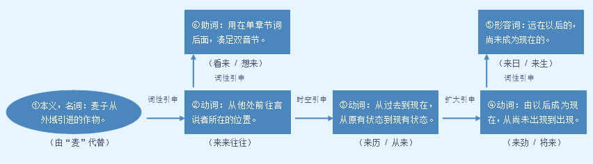 释义 | 来 1 (來)★★★ 00015名![]() (來) (來) 数 用在“十、百、千”等数词或数量短语后表示概数。 【例句】三百~人。 【同义】多;把 【辨析】“来”一般指比那个数目略小或略大;“多”只指超过那个数目;“把”只能用在“百、千、万”和“里、丈、顷、斤、个”等量词后,表示数量近于这个单位数,而且前头不能再加数词。 从别的地方向说话人所在的地方移动: ~信|~去自由|礼尚往~|他7点就~办公室了|昨天从外地~了几个朋友。 回 huí ~家|有来无~|你从哪里来就~哪里去吧|既然来了,就别这么早~宿舍。 去 qù 我一个人~|~买点东西|我~一下,马上就来|一来二~,大家就熟了。 往 wǎng ~返|~来频繁|勇~直前。 ❶从别的地方到说话人所在的地方(跟“去”相对)。作谓语,常带施事宾语,也可带补语。 大家都~了|车~了|那边~了几个背枪的|我班~了两位新同学|前面~了一大帮人|昨天~过三个人|他给我~过几封信|听说山下~人了|天下雨,他们恐怕~不了啦|敌人~得这么快,准是叛徒告了密|他~过两次|等两天我再~。 ❷(问题、事情等)发生,来到。作谓语,可带宾语、补语。 事情~了|问题~了|一下子~了这么多事情|病~得很快。 ❸做某个动作(代替意义更具体的动词,含有祈使或征求意见的意味)。常作谓语,可带宾语、补语。 这个角色很难扮演,还是让小李~吧|我和他下完这盘棋,你和他再~一盘,怎么样?|唱得好,再~一个|这话~得痛快|现在请小霞给大家~一段黄梅戏,好吗? ❹表示要做某件事。用在动词前面,与不加“来”意思相同。构成连动词组作谓语。 你~给大伙儿说说|都~出出主意吧|让我~解释一下吧。 ❺表示动作的趋向。有时读轻声。用在动词后面,作补语。 到底把你盼~了|汽车从县城开~的|请你下次一定带~|从前线传~捷报|邮局送~一份预订单|你说这些资料到底拿得~还是拿不~?|我们还谈得~|两人合不~|迪斯科我跳不~。 【反】 〈动〉❶去 往 【词语】 来宾 来不得 来潮 来归 来函 来回 来件 来劲 来客 来龙去脉 来路 来年 来人 来日 来日方长 来生 来势 来书 来头 来文 来信 来意 来由 ❶表示大概的数目。用在“十”“百”“千”等数词或数量词组后面。 10~年|50~天时间|60~岁|1000~人|1丈~宽|5米~高。 ❷衬字。用在诗歌、熟语、叫卖声里。 二月里~呀好春光|又唱歌~又跳舞|磨剪子~抢菜刀。 ❸相当于“来着”。用在疑问句尾,有时带有反问语气。一般用于口语。 你刚说什么~?|你到哪里去~?|那些话我多会儿说~? 字源解说 “来”是“麦”的本字。来,甲骨文 ![]() ![]() ![]() ![]() ![]() ![]() ![]() ![]() ![]() ![]() ![]() ![]() ![]() ![]() ![]() ![]() ![]() ![]() 附 文言版《説文解字》:來,周所受瑞麥來麰。一來二縫,象芒朿之形。天所來也,故爲行來之來。《詩》曰:“詒我來麰。”凡來之屬皆从來。 附 白话版《说文解字》:来,周代先人所接受的西域瑞麦。一支來麦有二支麦峰(指篆文 ![]() ![]() 引申线索 ![]() 【字族索引】 来 【同音字】 lái |