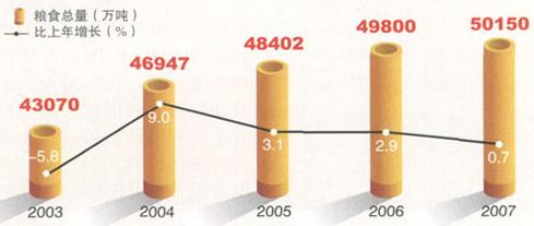 中国通过高新技术与常规技术结合、良种培育与耕作栽培结合,在农作物良种培育、高效栽培与农作制、地力培育与清洁生产、农业重大病虫害防控等方面取得了一系列重要成果,极大地提升了粮食综合生产能力,为粮食稳定增产,农民持续增收,保障国家粮食安全提供了强有力的科技支撑。中国通过对“粮食丰产科技工程”等项目的支持,集成创新了一批粮食丰产共性关键技术,在东北平原、华北平原和长江中下游平原的12个粮食主产省建立试验示范区1.2亿亩,示范区粮食单产在前3年平均单产的基础上增加10%以上,累计增产粮食516万吨。  2007年主要农产品产量及其增长速度  2003~2007年粮食产量及其增长速度