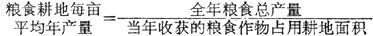 指种植粮食作物的耕地面积上平均每亩在一年中所生产粮食的数量。 反映粮食作物生产水平的指标。它是编制和检查长期计划和年度计划的依据。计算公式为:  公式中粮食作物占有耕地面积的计算有两种方法。 (一)直接计算法。 根据当年粮食作物实际种植情况,以逐丘逐块核实的基层单位粮食实际占用耕地面积为基础,逐级上报综合,确定粮食实际占用耕地面积。粮食实际占用耕地面积的计算是:在一个收获年度内,在一块耕地上全部种植粮食作物的,不管复种几次,都按原耕地面积计算为粮食实际占用耕地面积。 年内粮食作物和非粮食作物复种或套种的耕地,根据每种作物实际占用的次数按比例计算。但绿肥(留种用的部分除外)与粮食作物的复种,应全部作为粮食实际占用耕地面积;蔬菜与粮食作物复种,蔬菜不论年内种了几次,都按一次计算;粮食作物与非粮食作物间种或混种的耕地,根据各种作物实际占用耕地的比例计算。 (二)间接计算法。首先计算当年耕地的复种指数(用以计算的农作物总播种面积应扣除不收获任何农产品的绿肥播种面积);然后用粮食作物播种面积除以复种指数,计算粮食实际占用耕地面积。 |