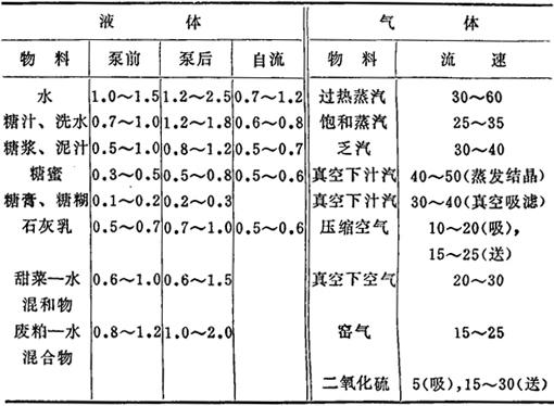 释义 | 糖厂主要物料在管道中的流速 糖厂管路中物料流速的选取,可参阅表13-27中数据。 表13-27 物料管道计算时选用的流速(米/秒) 注:1.过热蒸汽压力越高,流速越快 2.窑汽流速,越接近石灰窑流速越快 3.有关蒸发系统管路中物料流速见第五章第三节 |