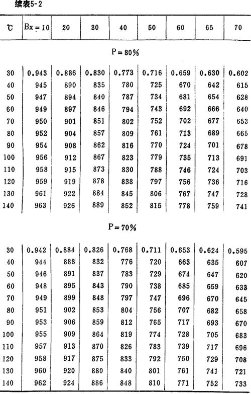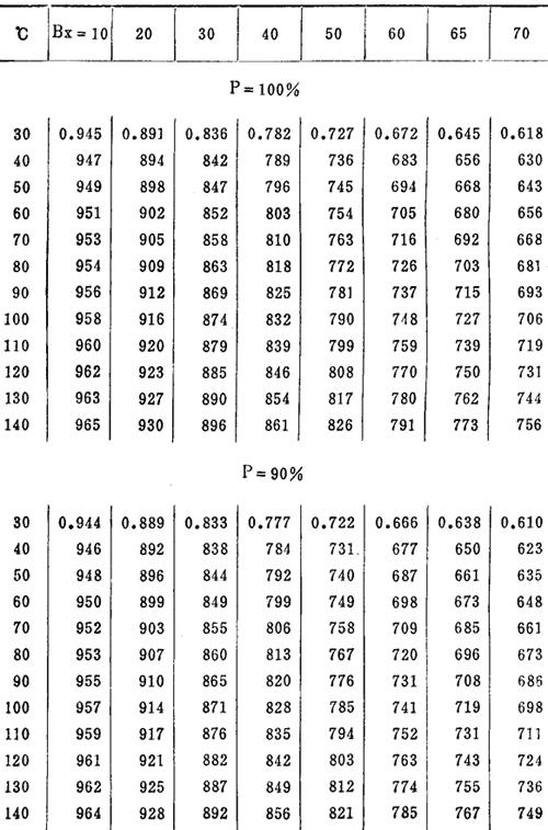 释义 | 糖液比热 1.糖汁和糖浆比热用下式计算 C液=C水-B〔0.65-0.0018t+0.0011(1-P)〕 (千卡/公斤·℃) 式中P,B,t,分别为糖液的纯度,固形物含量(克/克)及温度(℃);C液及C水分别为糖液及水的比热。 2.各种温度下不同纯度和锤度糖液的比热(见表5-2,P为纯度值)。 表5-2 不同温度下,不同锤度和纯度糖液的比热 |