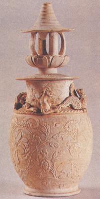 ◎明器/南宋 1964年江西景德镇湘湖汪澈墓出土 高35.5厘米 口径9厘米/江西省景德镇市陶瓷馆藏 ●此器由器身、器盖两部分构成。 器身直颈、折肩、深腹。器肩转折处有一周绳纹雕饰。肩上分置青龙、白虎、朱雀、玄武四灵,四灵造型生动简洁、装饰性强。 瓶身刻有四季花卉,类若浮雕有立体感,枝叶穿插顺畅自然。 以篦纹为地,与花饰构成肌理、光影的对比,造型更显华贵绮丽。器盖阔大薄平,亭形纽、柱形座。 其造型新颖之处还在它突破一般盖罐的比例关系,把纽放大占全器的1/3体量,成为整体器形三层结构中的一层,视觉上亦把它从“纽”的观念中解放出来。特别是帽式顶、覆莲底、圆弧形柱的亭式结构,显得精巧、灵动,有向上延伸之感。此罐胎质坚实细腻、造型新巧、纹饰华美,为南宋景德镇烧制明器中的精品。 |