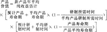 这个公式是“投资价值模型”的基础,它表明新产品的开发研制价值,不仅要估计它的纯收益和研制费,而且要考虑平均的产品研制时间和产品寿命周期,其计算方法如下: