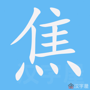 释义 | 焦 1 ★★★ 01624名![]() 物体受热后失去水分呈现黄黑色并发硬、发脆。 a.作谓语。 饭~了!|舌敝唇~。 b.作补语。 树被烧~了|我把衣服熨~了|面包烤得太~了。 焦炭。常用作语素构成合成词。 炼~|煤~|~炭|~土。 【近】 糊 【词语】 焦点 焦黑 焦化 焦黄 焦距 焦渴 焦枯 焦雷 焦煤 焦炭 焦头烂额 焦土 焦心 焦油 焦炙 字源解说 焦,金文 ![]() ![]() ![]() ![]() ![]() ![]() 附 文言版《説文解字》: ![]() ![]() ![]() ![]() ![]() 引申线索 ![]() 【字族索引】 隹 焦 【同音字】 jiāo |
