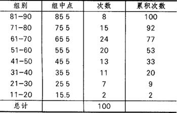 释义 | 累积次数分布表 又分“以下”累积次数分布和“以上”累积次数分布两种。 当想要知道某个数值以下(或以上)的数据有多少时,需编制以下(或以上)累积次数分布表。编制累积次数分布表只需在简单次数分布表的基础上由下向上(以下)或由上向下(以上)逐组累积相加即可得到。下图是以下累积次数分布表一例。 从表中我们可以知道任何一组以下的人数,比如81分以下的有92人,60分以下的有53人。 |