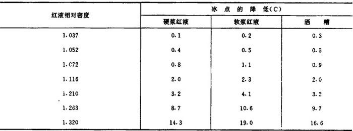 【说明】 红液的冰点随固形物含量的增加而降低,见表1-11-6。
