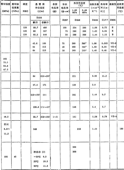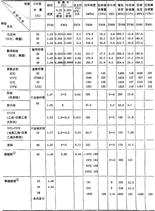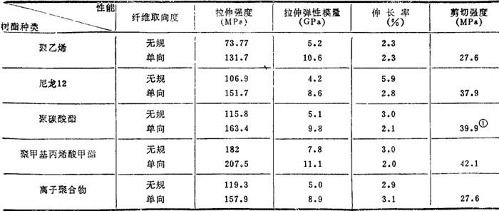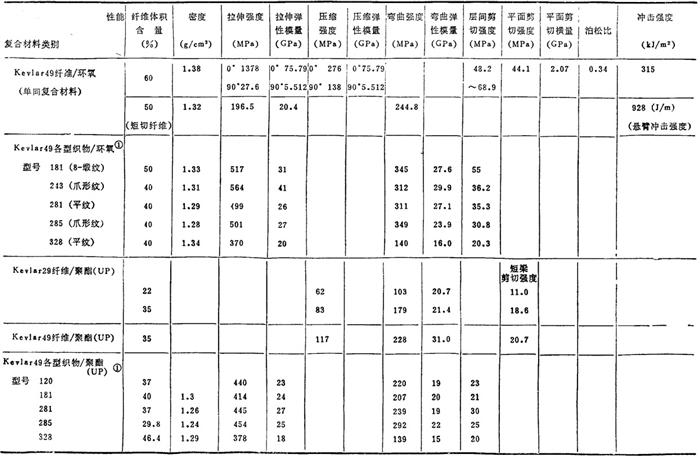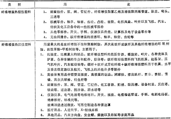 4.4.1 纤维增强复合材料的性能 玻璃纤维增强塑料的性能可参见表2.2-4~2.2-7;碳纤维增强塑料的性能见表2.2-34和2.2-35;Kevlar纤维及其织物增强塑料的性能见表2.2-36和2.2-37。 表2.2-34 碳纤维增强热固性塑料(CFRP)的主要物理、力学性能   注: ❶ 用湿法手糊成型。 表2.2-36 Kevlar纤维及其各型织物增强热固性塑料的主要物理、力学性能  注: ❶ 用湿法手糊成型。 表2.2-37 Kevlar短纤维复合材料(纤维含量20%)的力学性能  注: ❶ 未完全破坏。 4.4.2 纤维增强塑料的用途 见表2.2-38。 表2.2-38 纤维增强塑料的用途  |