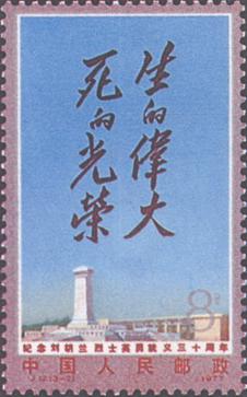 释义 | 纪念刘胡兰烈士英勇就义三十周年 发行日期:1977年1月31日 齿孔度数: 印刷版别:影写版 票幅:31×52 全张枚数:40(10×4) 设计者:叶武林 印刷:北京邮票厂 (1)8分 刘胡兰烈士像 1200万枚 (2)8分 “生的伟大死的光荣” 1200万枚 (3)8分 发扬刘胡兰的革命精神 1200万枚 (1)-(3) 3枚全 |