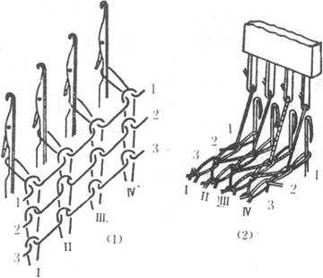 释义 | 纬编 每一横列丝线喂入织针,依次弯曲成圈,如图5-10(1)(2)由一根丝线纬向编织。纬编是纬编针织机生产的,纬编针织机生产的产品很多,既可生产各种组织的针织绸,也可生产符合各种人身部位需要的如手套、丝袜等针织品。 图5-10 |