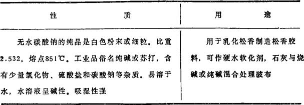 注: ❷ 碳酸钠一项除用户提出要求外,不作检验。 ❸ 特种工业用,系指用于照像、化学试剂或其他高标准特殊的用途。其中NaCl、Fe2O3和水不溶物或按低限或接近低限生产。 2.性质与用途 表1-5 纯碱的性质与用途