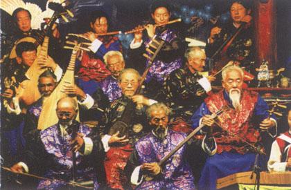 释义 | 纳西族 人口为308839人。 纳西族主要聚居于云南省丽江纳西族自治县和四川省、西藏自治区的一些地区。根据2000年第五次全国人口普查统计,纳西族人口数为308839人。使用纳西语,属汉藏语系藏缅语族彝语支。由于同汉族交往较多,群众多能使用汉语文。 纳西族曾在古代有过表意的象形文字,称东巴文;另一种是表音的音节文字,称为哥巴文。但都未在群众中推广使用,只是记载了古代的许多诗歌、传说、故事和宗教经典。1957年,设计了以拉丁字母为基础的拼音方案。 纳西象形文字产生于1000多年前。 最初为东巴教徒传授使用,写《东巴经》,故亦称为东巴文。13世纪初年,又创造了一种表音文字,叫哥巴文。《东巴经》卷帙浩繁,是纳西族的宗教经书,是研究纳西族社会历史发展、语言文字和宗教信仰的宝贵资料。纳西族的《创世纪》,是一部描写纳西族人民开天辟地、与大自然搏斗、歌颂劳动、反映男女忠贞爱情的著名的长篇史诗。 还有《游悲》、《相会调》等都是以浪漫主义手法、富于独特的民族风格的文学作品。纳西族人民能歌善舞,在生产劳动或民族节日中常有群众性的歌舞活动。乐曲以笛子曲、口弦曲、葫芦笙舞曲较为普遍,优美清新,粗犷有力。《白沙细乐》和《丽江古乐》是有名的两部大型古典乐曲。 纳西族传统节日有“正月农具会”、“三月龙王庙会”(现为物资交流会)和“七月骡马会”。此外,还有春节、清明节、端午节、中秋节、火把节等。 云南省丽江古城演奏纳西古乐的老人 |