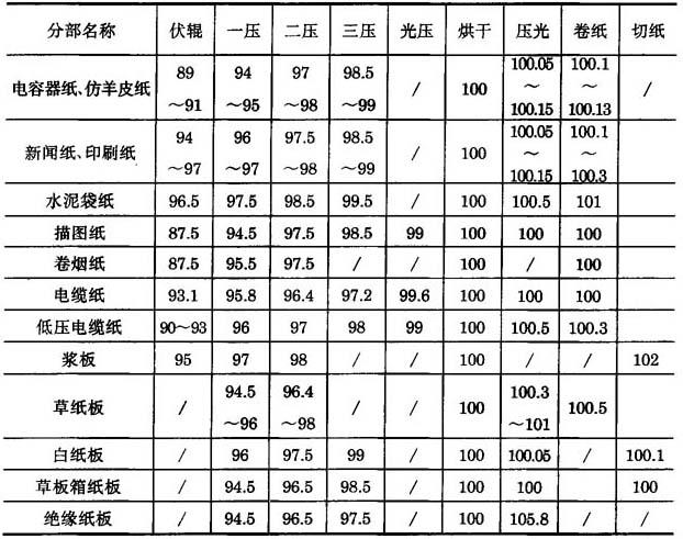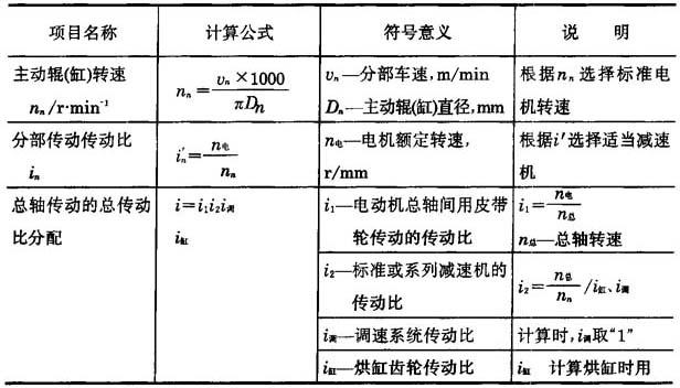 分部车速指所驱动的主动辊(缸)的线速度,其计算公式为:  式中 vn——分部车速,m/min v——纸机车速,m/min in——某分部相对车速比 n——某分部号 总轴传动的纸机,分部即各传动点。 1.纸机传动分部相对车速比(in) 纸机的分部车速,相对于该机所配属的卷纸机的车速或最末一组烘缸的分部车速的比率,称为相对车速比,或简称速差率,如表11-8-5所示。 表11-8-5 分部传动相对车速比(%)  2.传动分部中主转动件转速的计算 表11-8-6 传动分部中主转动件转速的计算表  |