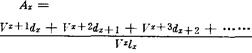 其中,Ax代表终身死亡保险保险金额为一元的趸缴纯保险费。V为贴现因子(1+i)-1,dx为x岁与x+1岁之间的死亡人数,Cx、Dx与Mx常称为寿险精算换算符号。