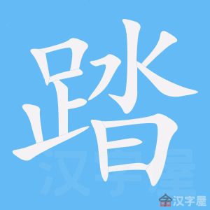 踩,走;在现场(查勘)。可重叠。常作带宾、带补谓语。 他独自一人~着拍子唱歌,显得怡然自得|这条小路上~了很多足印|这些幼苗被马~死了|我们又~上了新的征途|玻璃板上有人用脚~过|他用脚~了~,泥土很松软。 【近】 踩 走 【词语】 踏板 踏步 踏勘 踏看 踏青 【注意】 又读tā,如:踏实。