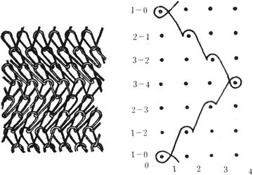 经编织品中的基本组织,当经线的垫纱运动在一定数量的横列上向一个方向连续转移,然后再反方向移动相等数量的横列,这就形成经缎组织。根据梳栉在一个方向垫丝的针数可分为如图5-20的三针经缎(连续在三枚针上垫纱),其数为1-0,1-2,2-3,3-4,3-2,2-1和四针经缎(连续在四枚针上填纱)等。