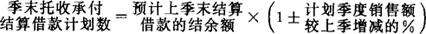 它是企业编制银行借款计划的一个方面,托收承付结算借款计划数的确定,通常是以上季末结算借款的结余额为基础,结合计划季度销售额的增减幅度来估算的。其计算公式如下: